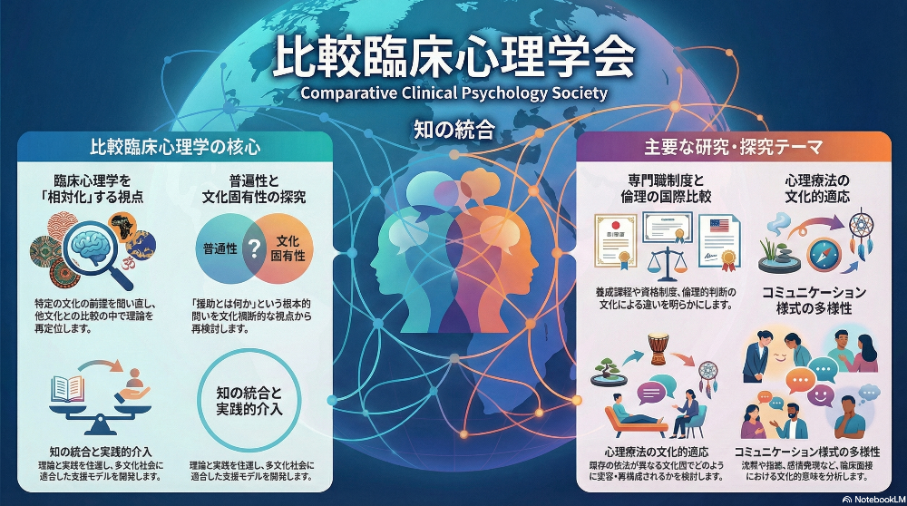 比較臨床心理学は、各国の臨床心理学を単に紹介・翻訳する領域ではない。むしろ、異なる文化圏における「心理的問題の構成のされ方」「援助の枠組み」「治療者―クライエント関係」「専門職の制度化や養成の方法」といった諸要素を比較することで、それぞれの背後にある文化的前提、制度的条件、価値観の構造を可視化する営みである。